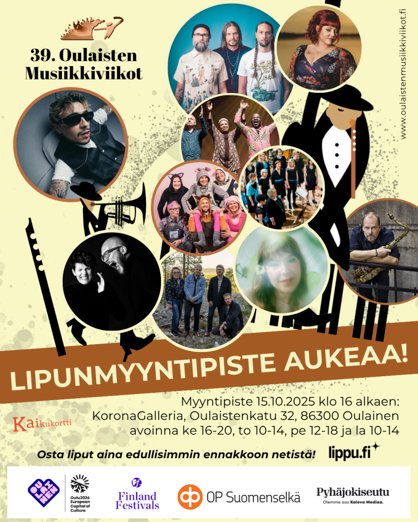 Oulaisten Musiikkiviikot järjestetään jo 39. kertaa! Tämän vuoden fyysinen lipunmyynti käynnistyy keskiviikkona 15.10.2025 klo 16 KoronaGallerialla (Oulaistenkatu 32). Lipunmyyntipiste on avoinna gallerian aukioloaikoina siirtyen konserttipaikalle noin tuntia ennen konsertin alkua.